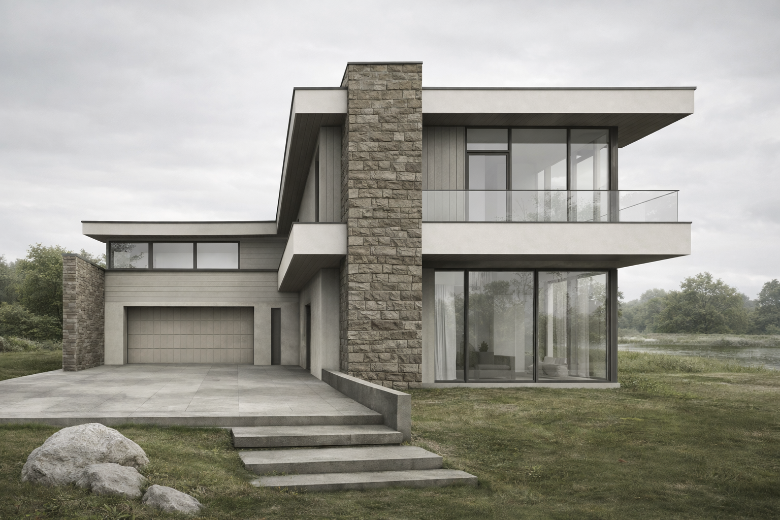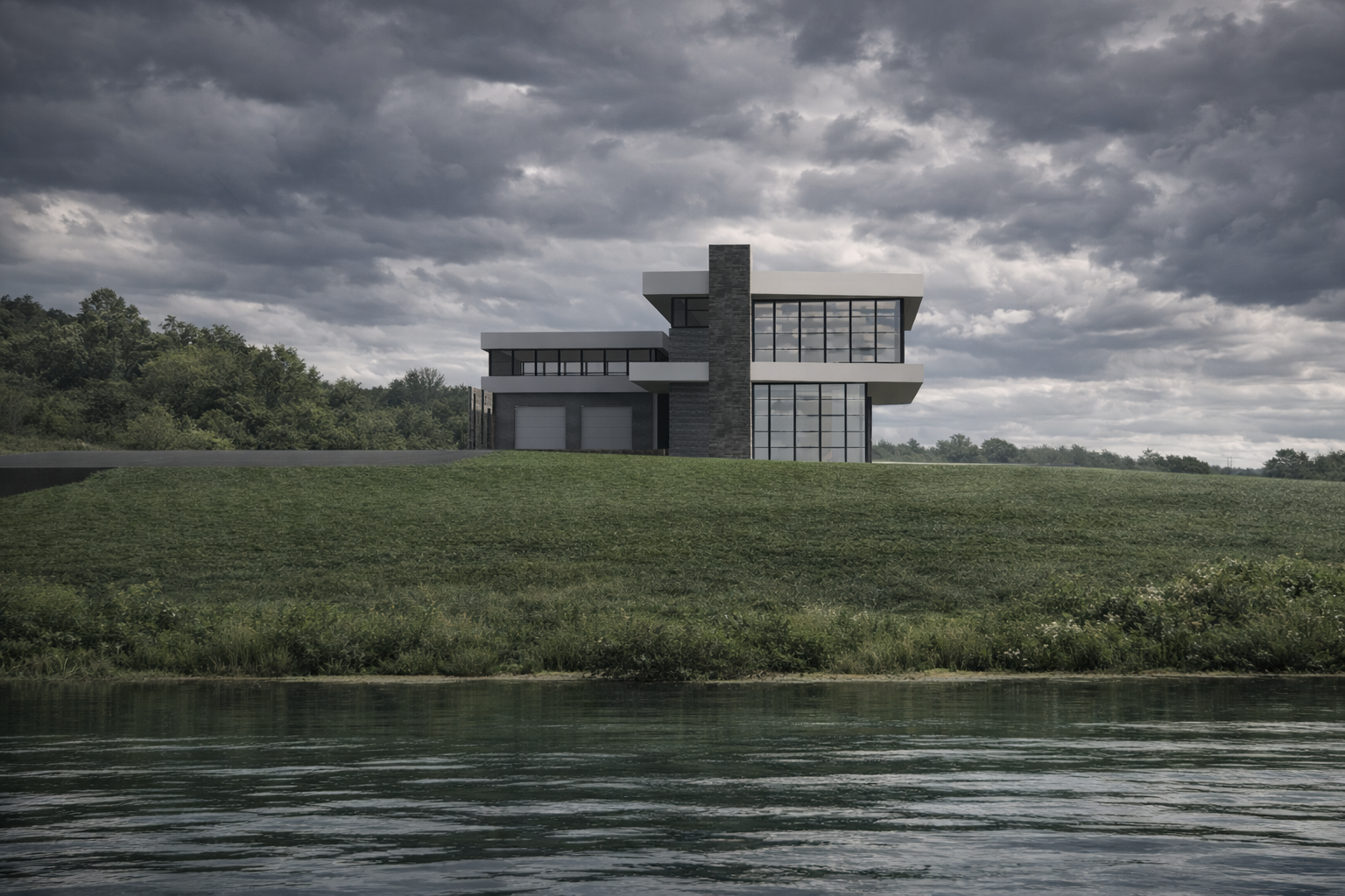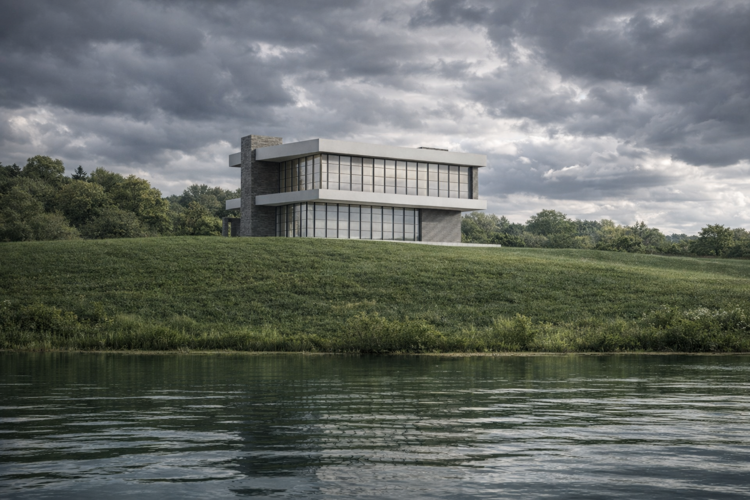 Ramus, horizontalus namas, švelniai įkomponuotas į kraštovaizdį. Dideli stikliniai paviršiai atveria interjerą į vandenį ir tolimą horizontą, leisdami šviesai ir atspindžiams tapti kasdienio gyvenimo dalimi. Kompozicija paprasta ir subalansuota – tvirti akmens tūriai ir lengvas tinkas įrėmina permatomas erdves, kurdami ramų dialogą tarp masės ir atvirumo. Pastatas lengvai pastatytas ant kalvos, pabrėžiant ilgas linijas, švelnias medžiagas ir stiprų ryšį su gamta. Architektūra nedominuoja kraštovaizdžio, o tampa jo dalimi.