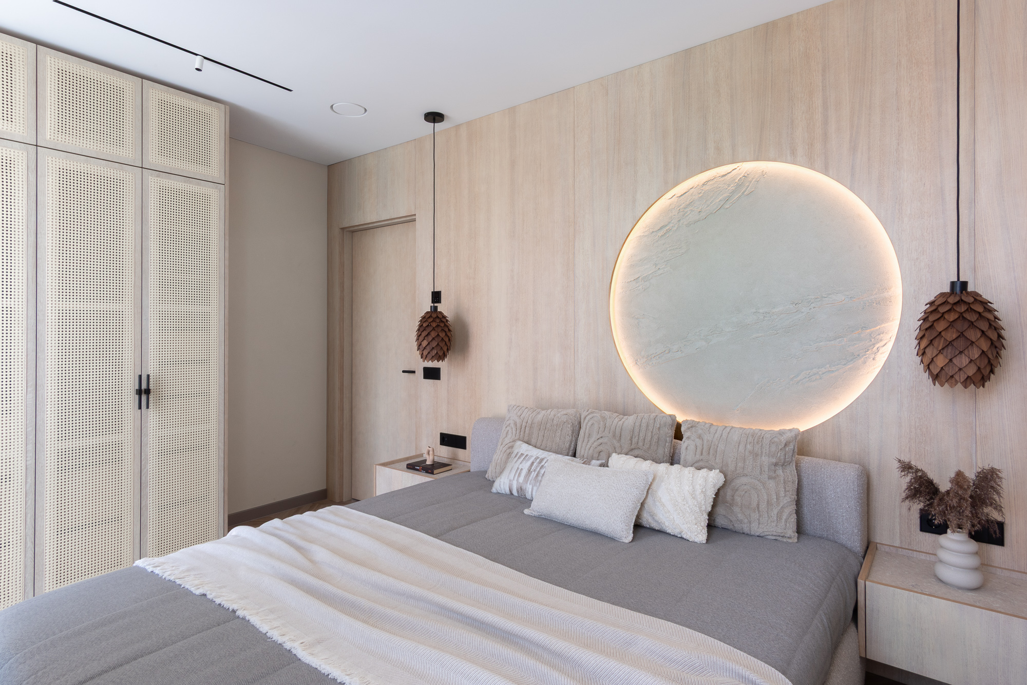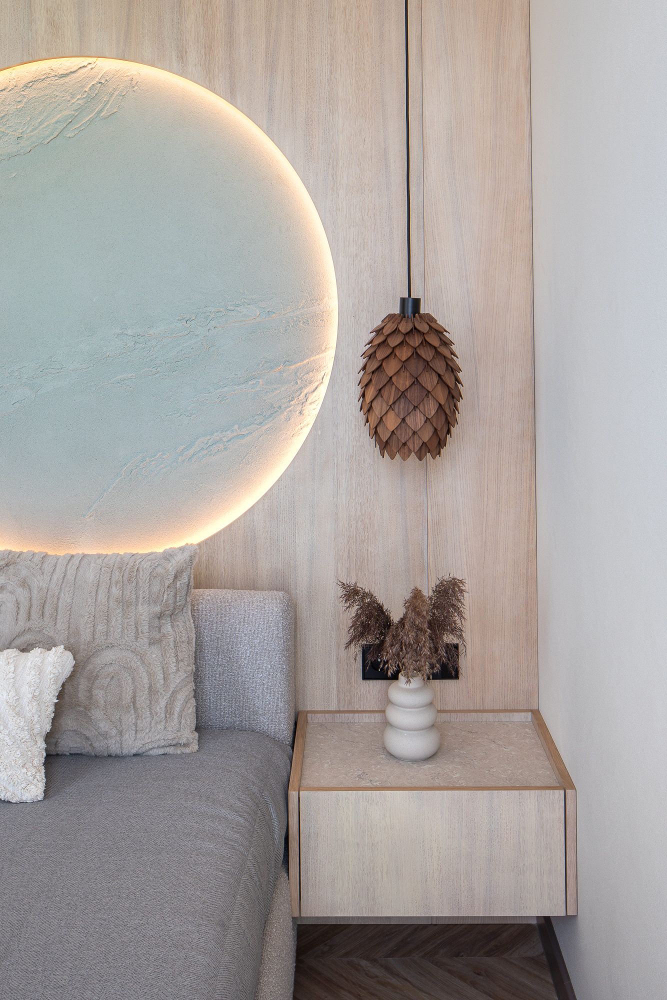 Apšvietimas projekte suvokiamas kaip lygiavertė dizaino priemonė. Derinami funkciniai ir akcentiniai šviesos šaltiniai, paslėptos šviesos linijos išryškina paviršių tekstūras, nišas ir architektūrinius elementus. Miegamojo erdvėje apvalus šviesos elementas tampa emociniu interjero akcentu, subtiliai referuojančiu į gamtos cikliškumą ir vandens horizontą.