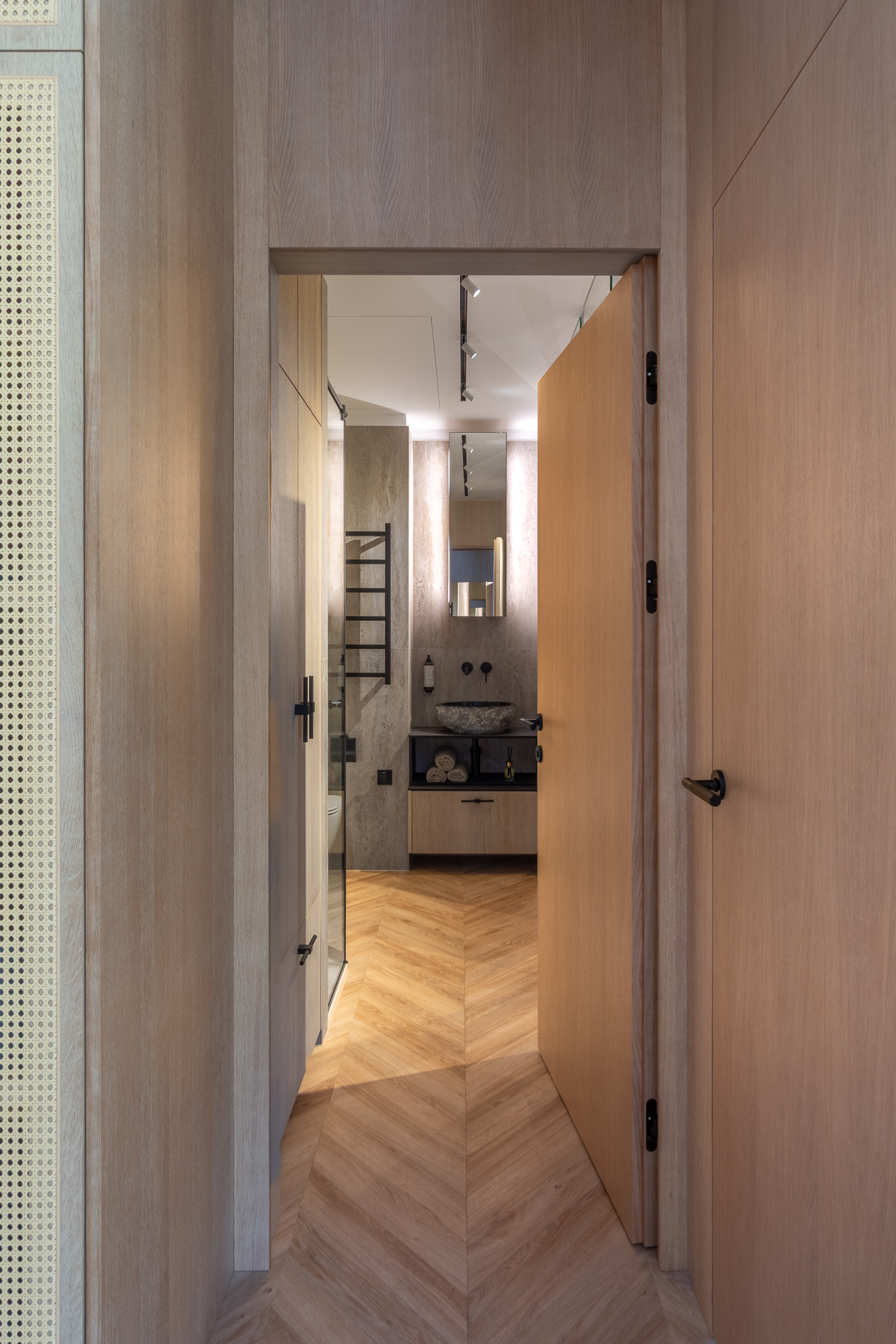 Vonios kambaryje dominuoja natūralaus akmens apdaila, minimalistiniai santechnikos sprendimai ir tiksliai apgalvotos proporcijos, kuriančios SPA tipo atmosferą, orientuotą į kasdienį komfortą ir estetinę švarą.