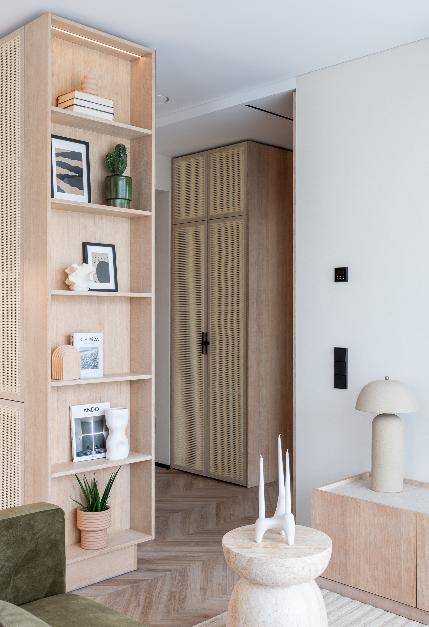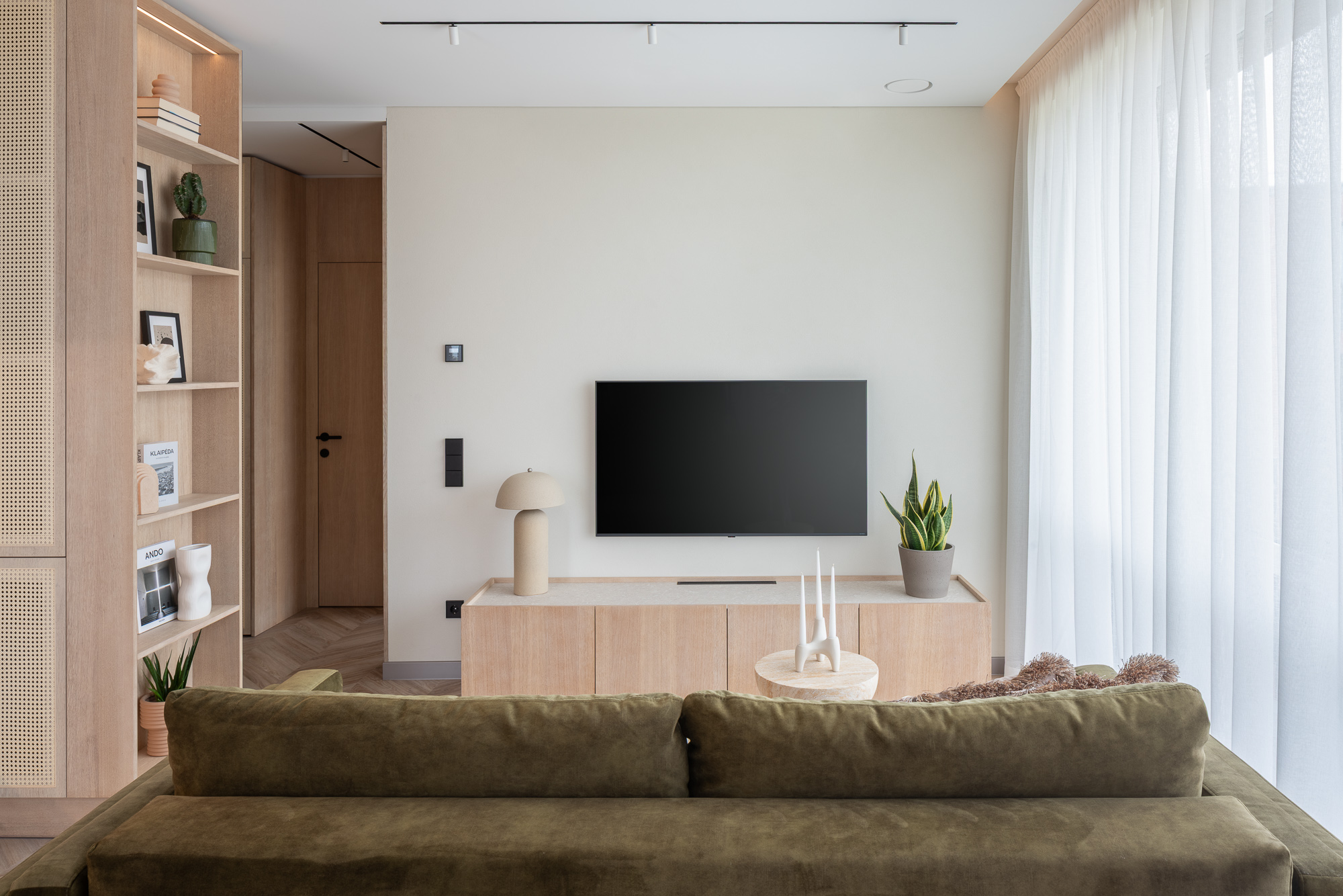 Interjere dominuoja šviesi, rami spalvinė paletė ir natūralios medžiagos – šviesus medis, akmens ir molio tekstūros. Šios medžiagos formuoja vientisą foną, kuriame svarbia tampa šviesa, faktūra ir proporcijos. Perforuotų plokštumų sprendimai balduose suteikia vizualinio lengvumo, leidžia masyvesniems tūriams išlikti taktiškiems bei santūriems.