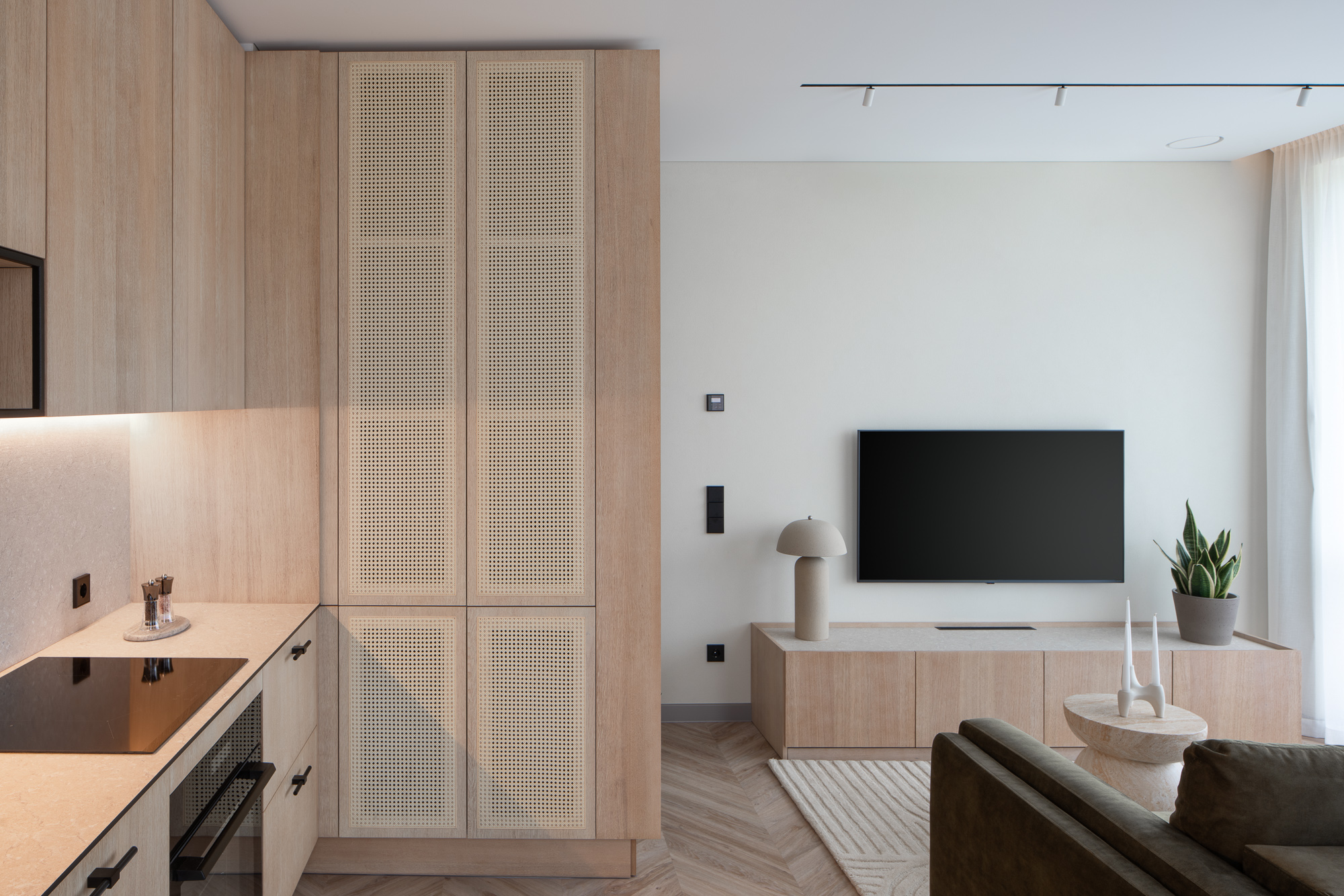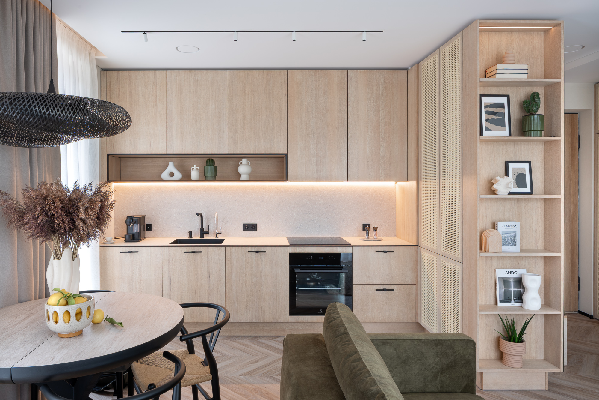 Erdvinė struktūra kuriama kaip aiški ir nuosekli sistema. Virtuvės, valgomojo ir svetainės zonos jungiamos į bendrą gyvenamąją erdvę, kurioje interjero ir baldų sprendiniai veikia kaip viena visuma. Integruoti baldai projektuoti kaip interjero architektūros dalis – jie ne tik atlieka funkciją, bet ir padeda formuoti erdvės ritmą.