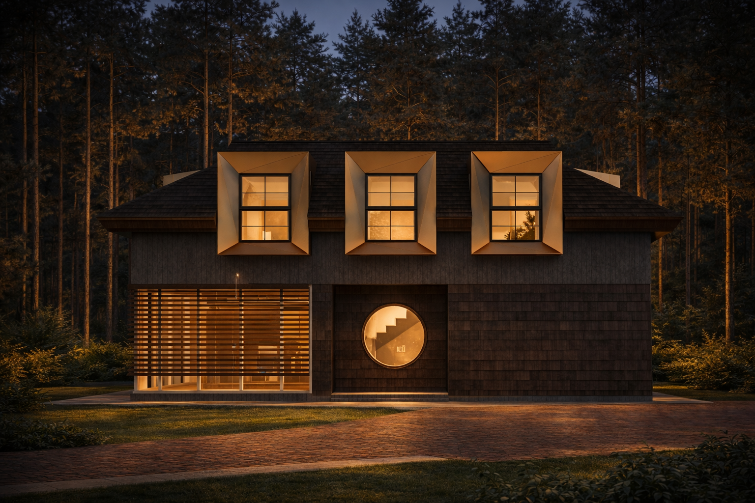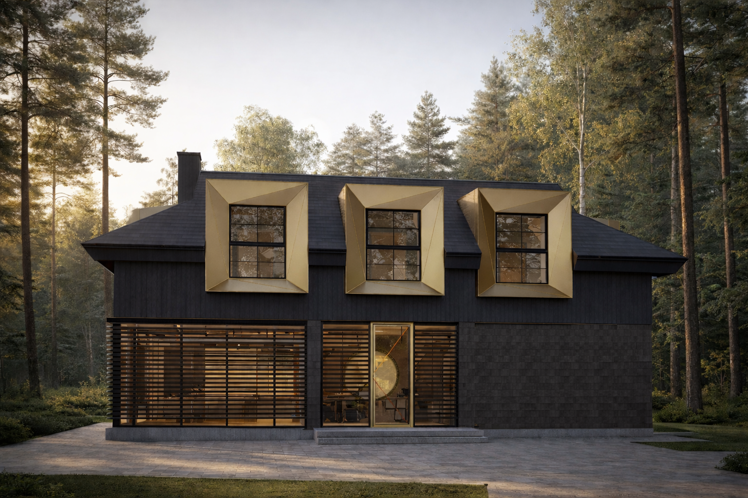 The house is placed quietly within the forest landscape, allowing the surrounding trees and natural light to define its atmosphere. The architecture follows a clear and calm composition where traditional proportions are gently reinterpreted through contemporary elements.